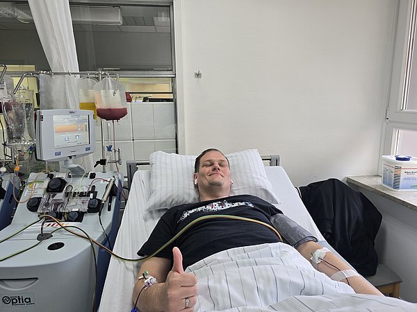 Ob sich der Weg zur Spende gelohnt hat? „Ja“, sagt Michi. „Man gibt so wenig und kann so viel bewegen.“ Was am Ende bleibt, ist der Stolz und das Gefühl, geholfen zu haben. Wenn andere Therapien nicht anschlagen, ist für viele Patient:innen mit Blutkrebs oder anderen Erkrankungen des blutbildenden Systems eine Stammzellenspende die einzige Möglichkeit auf Heilung. Sich typisieren zu lassen, also für eine mögliche Spende registrieren zu lassen, würde Michi jedem empfehlen. Nach der Spende erhält er einen anonymen Brief vom Krankenhaus. Die Person, für die er gespendet hat, bedankt sich darin bei ihm. In zwei Jahren können Spender und die empfangende Person die Anonymität aufheben, sofern sie dies wünschen.